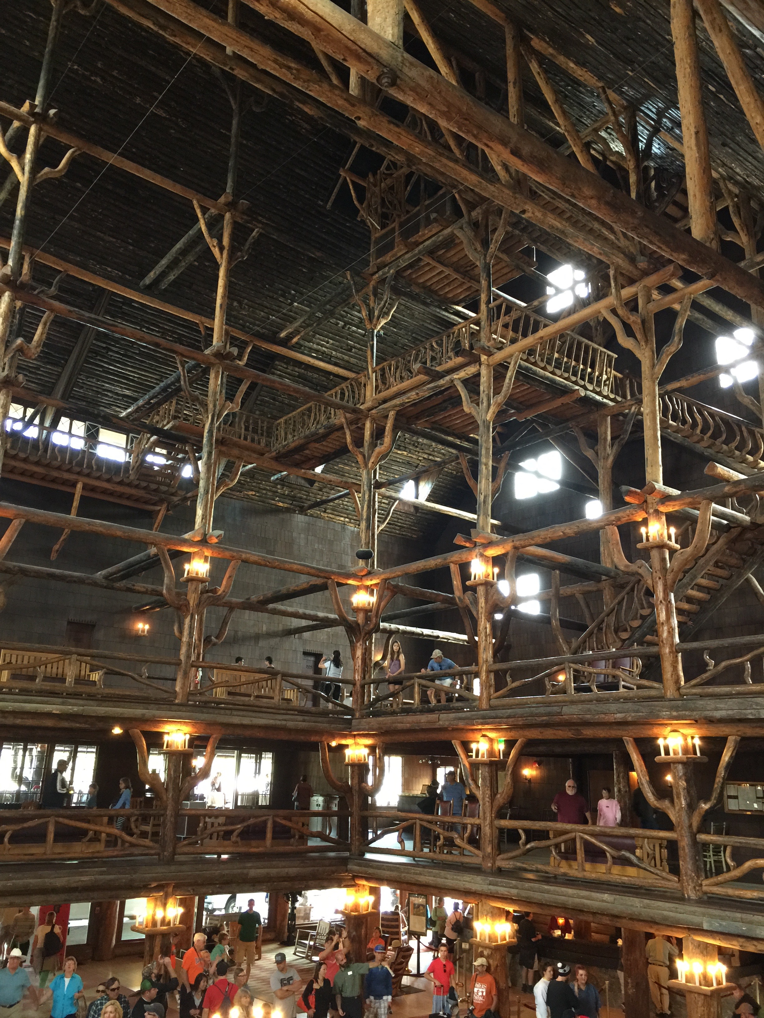 Good Old Faithful blew right on time & then we went to explore the best lodge we’ve ever seen. Whoa, talk about a great tree house adventure…the Old Faithful Inn is awesome & I have a feeling it was one of my dad’s highlights.